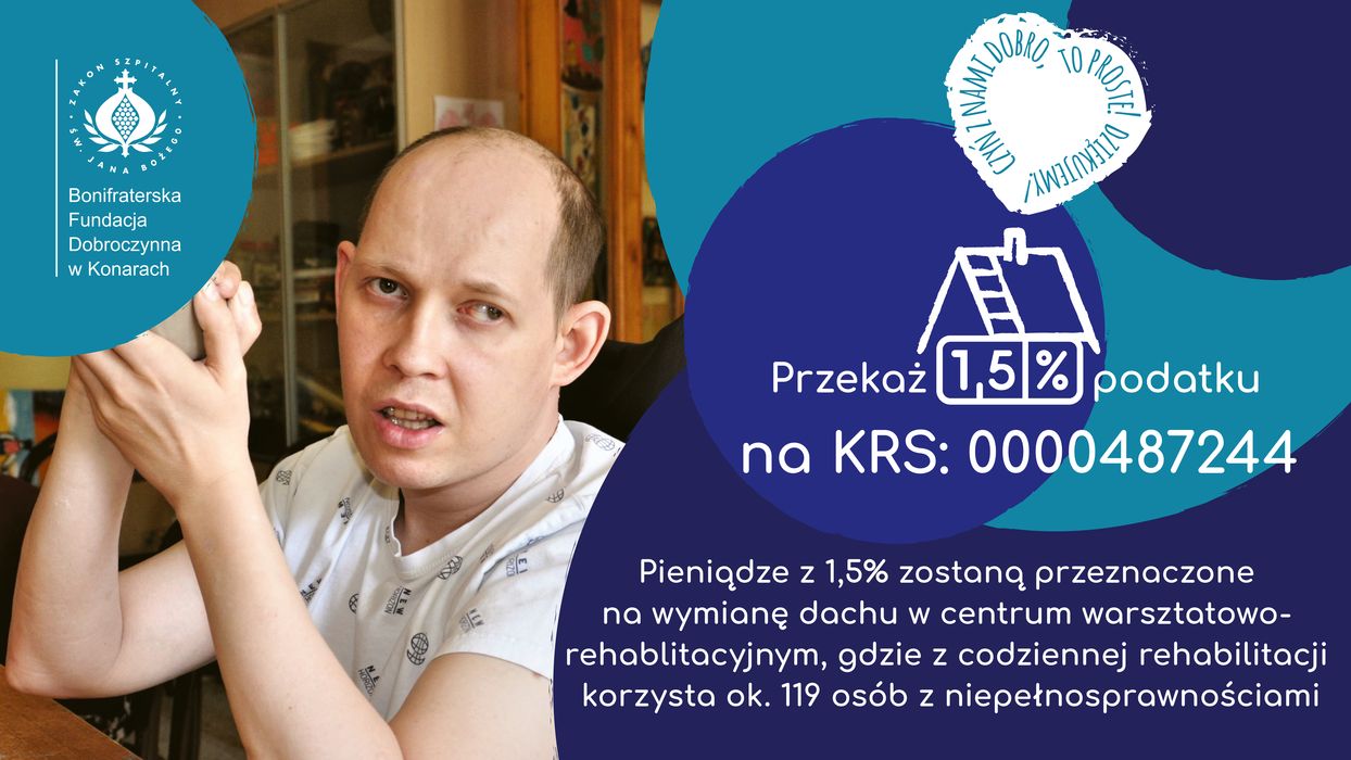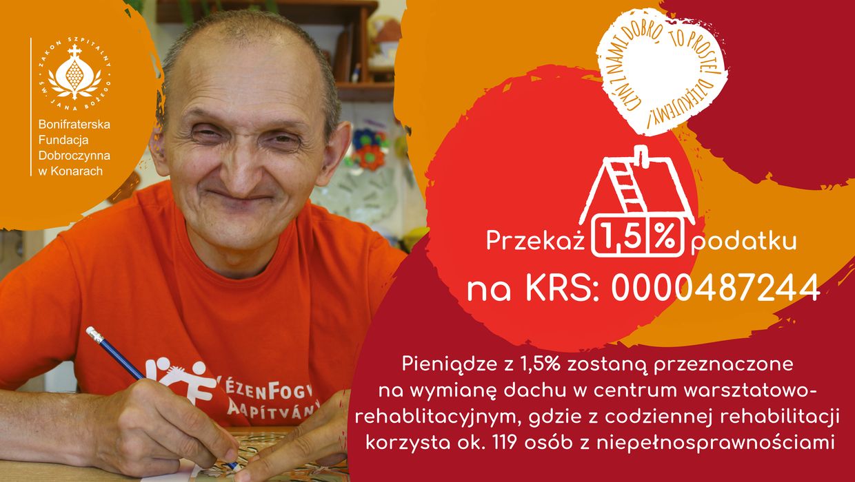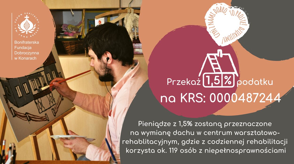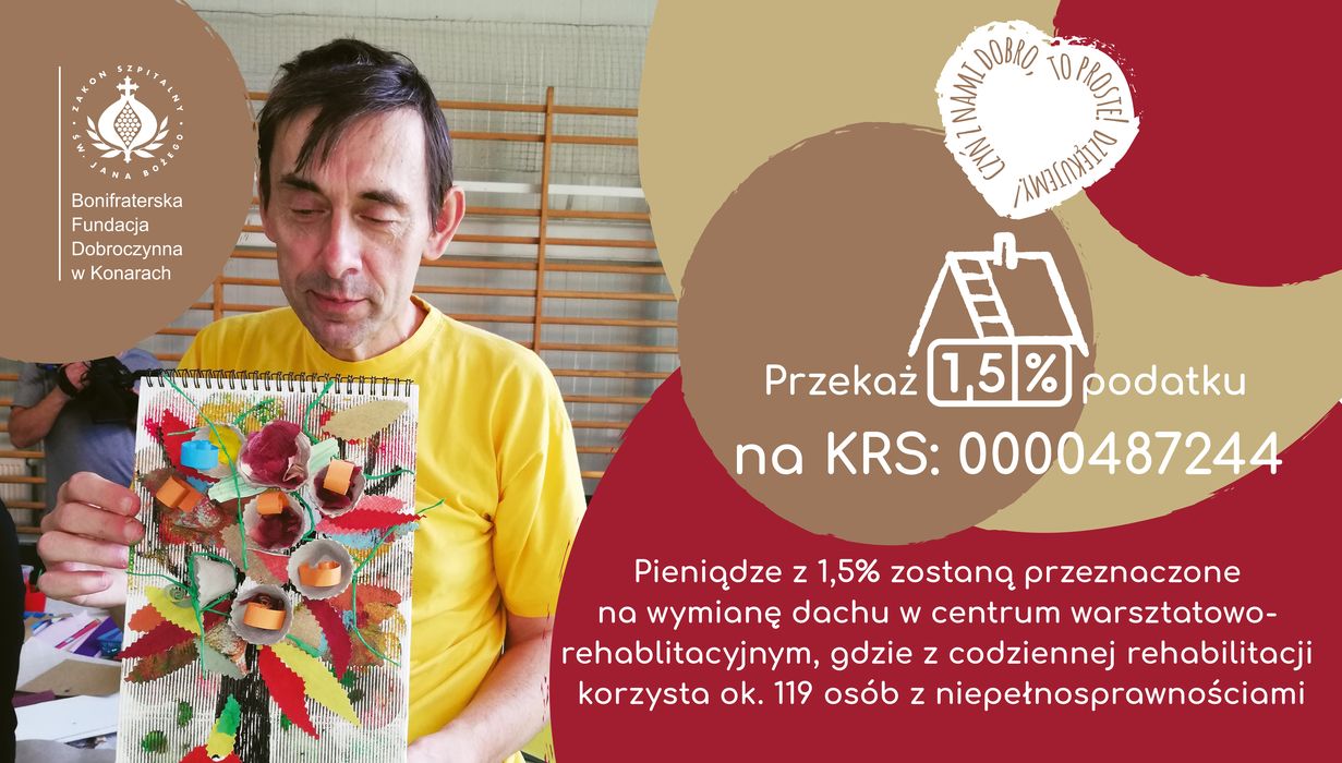 W tym roku naszą największą bolączką jest przeciekający dach w Centrum Warsztatowo-Rehabilitacyjnym. Jest to ok 3 tys. m2 dachu, który wymaga gruntowego remontu. Dlatego jak tylko możemy to prosimy o wsparcie w wymianie dachu wszystkich ludzi dobrej woli! Możliwości jest wiele w zależności od indywidualnych możliwości. W tym okresie rozliczeniowym serdecznie prosimy o przekazanie 1.5% na rzecz Fundacji KRS: 0000487244, które zostaną przekazane właśnie na tę potrzebną inwestycje. Inne możliwości wsparcia to oczywiście darowizna finansowa, rzeczowa ale również udział w naszych warsztatach, wydarzeniach czy zakup naszego rękodzieła czy produktów.