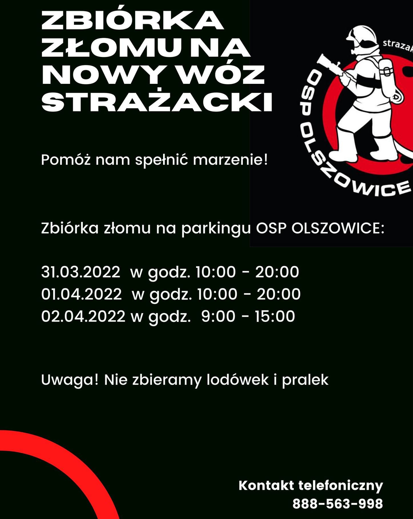 Dlatego przypominamy - każdy z Państwa kto chciałby nas wspomóc w tej kwestii, prosimy o dostarczenie złomu pod strażnicę OSP Olszowice w dniach:
