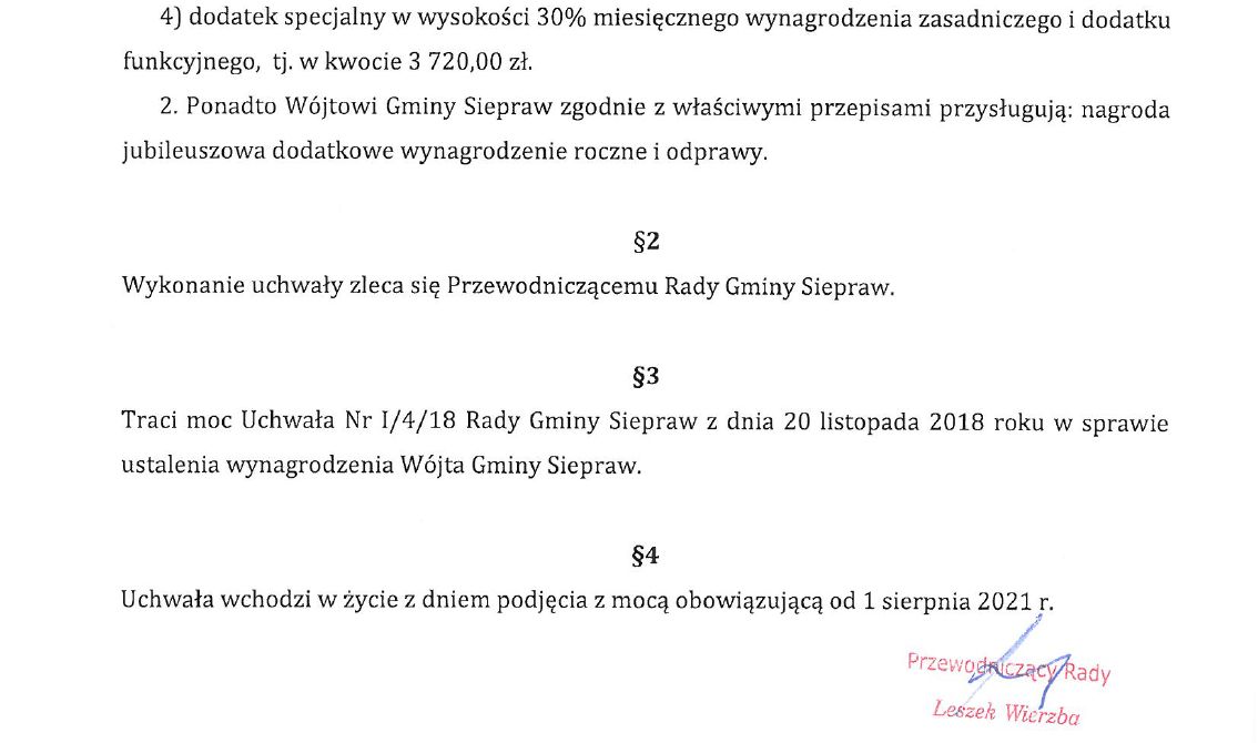 Czyli podwyżka jaką zatwierdzili jednogłośnie radni wynosi 7840 zł miesięcznie. Jak zaznaczono w uchwale, Wójtowi według właściwych przepisów przysługują : nagroda jubileuszowa, dodatkowe wynagrodzenie roczne, oraz odprawy.