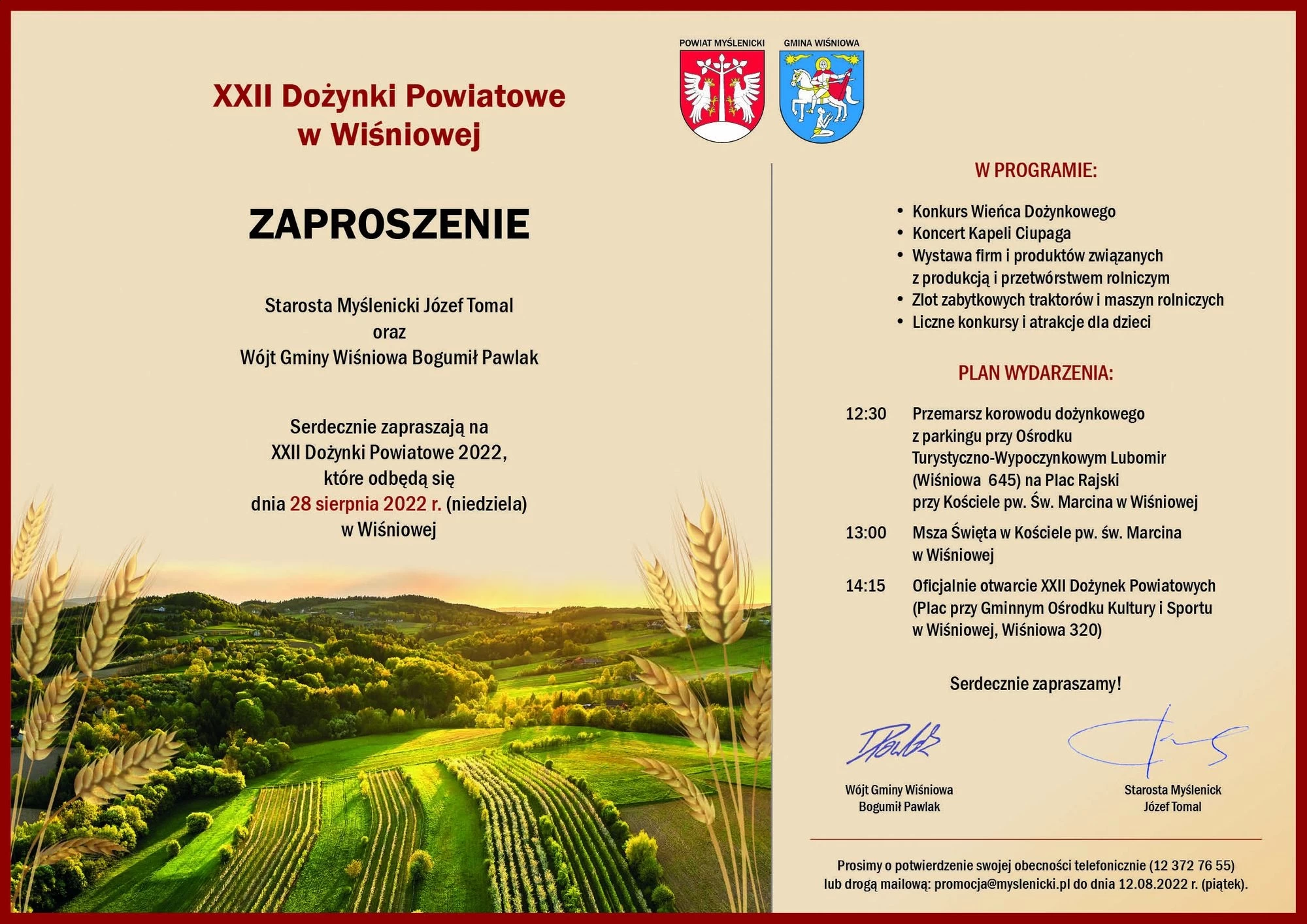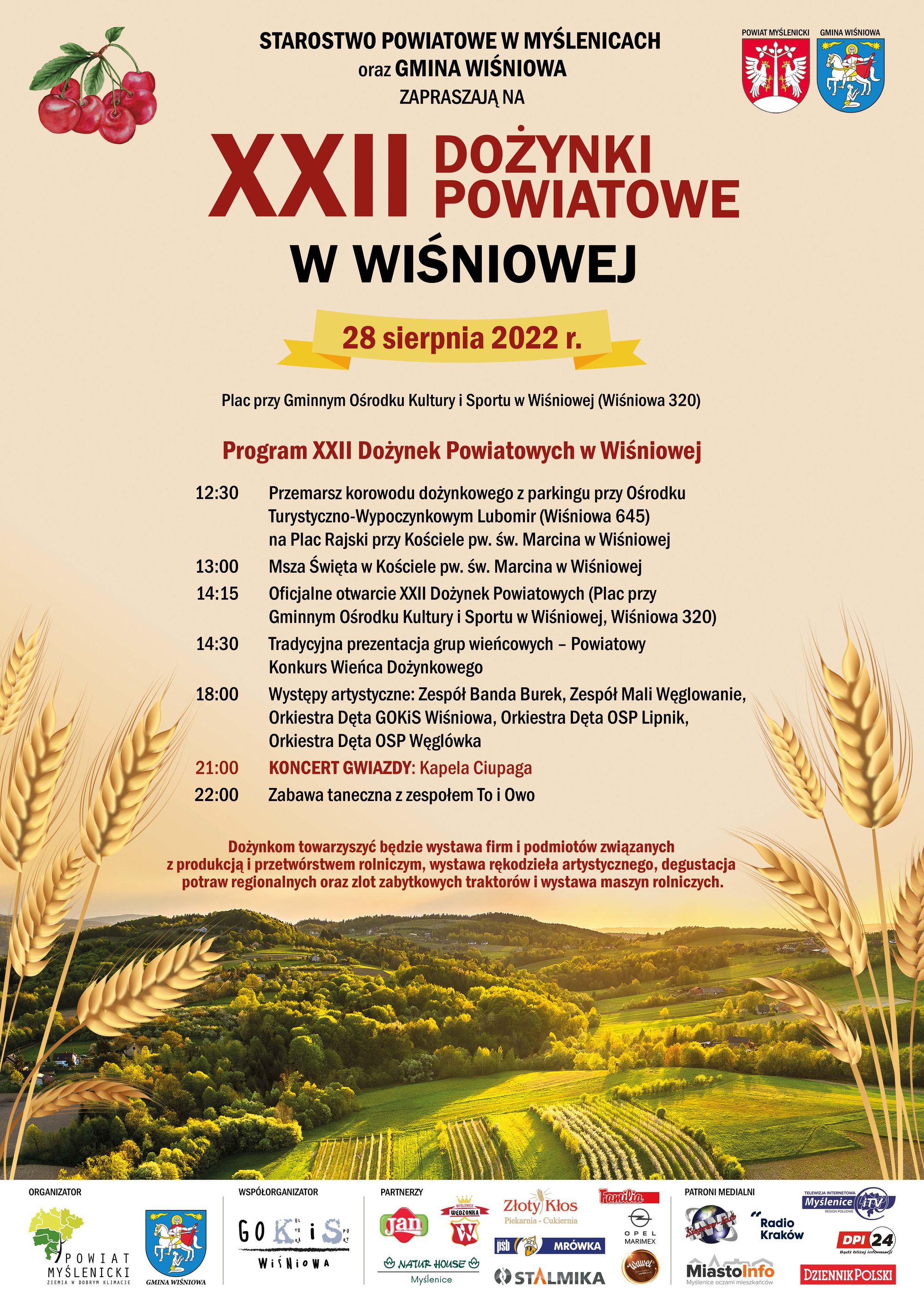 Starosta Myślenicki Józef Tomal oraz Wójt Gminy Wiśniowa Bogumił Pawlak, serdecznie zapraszają na XXII Dożynki Powiatowe, które odbędą się 28 sierpnia 2022 r. w Wiśniowej.